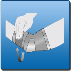 Unfasten the strap and slide the arm into the support, widest side first, and pull over the elbow.