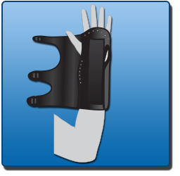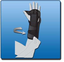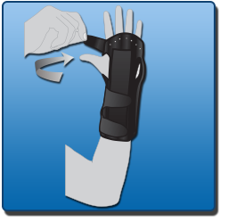 Slide your hand into the sleeve so your thumb is in the opening and the splint is positioned against the forearm. The cushion pad should rest in your palm.