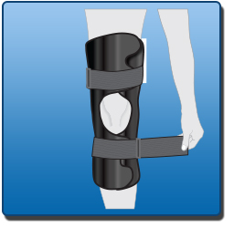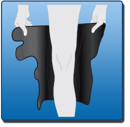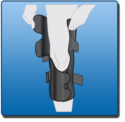 Fasten the two “flaps” below the knee securely then fasten the two “flaps” above the knee. Ensure that the knee is centered in the opening.