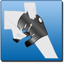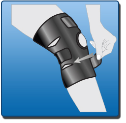 Unfasten all straps and lay support over the knee with the single strap to the outside of the knee. Center the opening over the kneecap. While holding support in place, wrap the middle strap around the back of the knee and attach to the other side.