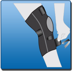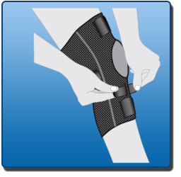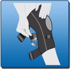Unfasten all straps and lay the support over the knee with the compression pad positioned under the knee. While holding support in place, wrap middle strap behind the kneecap and fasten on the other side of the support.