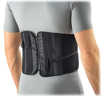 Open all straps. Center the support against your lower back with the lacing centered across the spine.