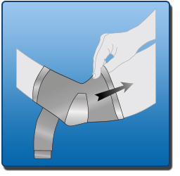 Unfasten the strap and slide the arm into the support, widest side first, and pull over the elbow.