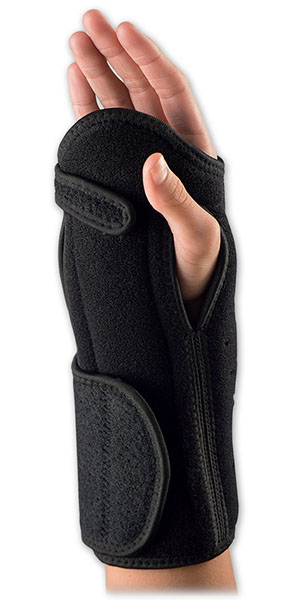 Slide your hand into the sleeve so your thumb is in the opening and the splint is positioned against the forearm. The cushion pad should rest in your palm.
