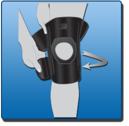 With your leg straight, wrap the bottom strap behind the knee and fasten it to the stabilizer. Repeat with top strap. Adjust all straps until the fit is secure yet comfortable.