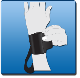 Open all straps. Position the pressure pad over the base of your palm. Wrap and secure the main strap.